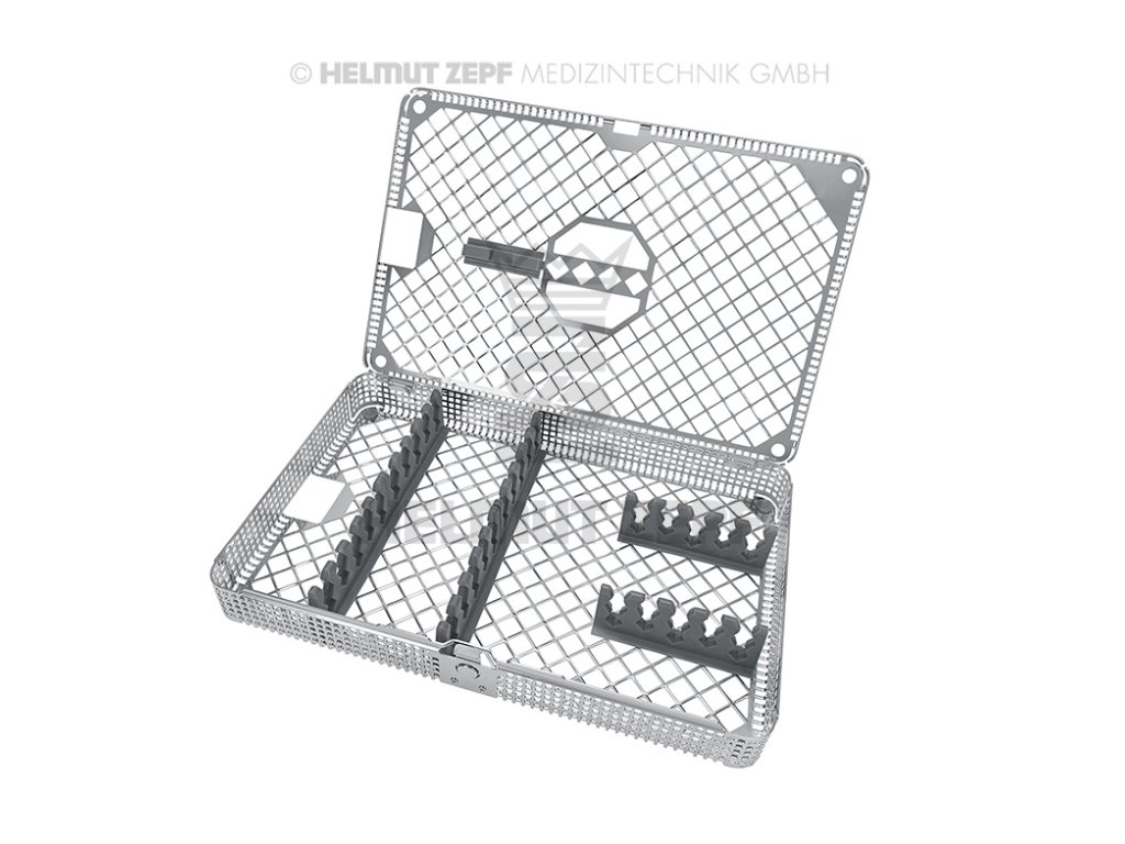 Sterilizační box se silikonovými prvky pro až 15 nástrojů.